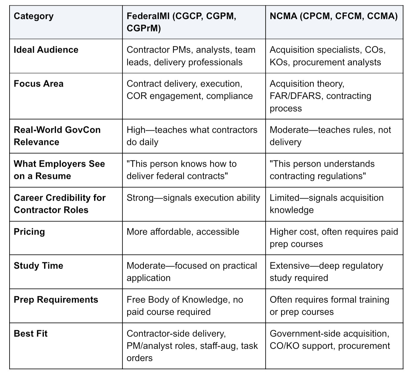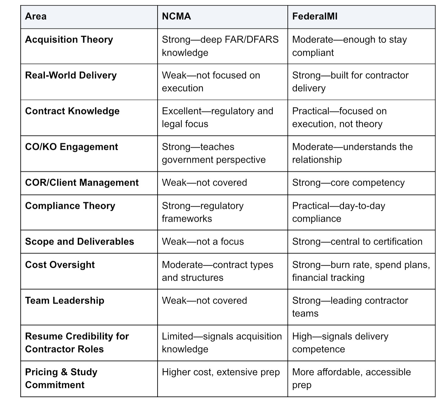 If you're building a career in government contracting, you've probably seen both FederalMI and NCMA certifications mentioned. Both are respected. Both show up on LinkedIn profiles. But they're built for very different purposes.