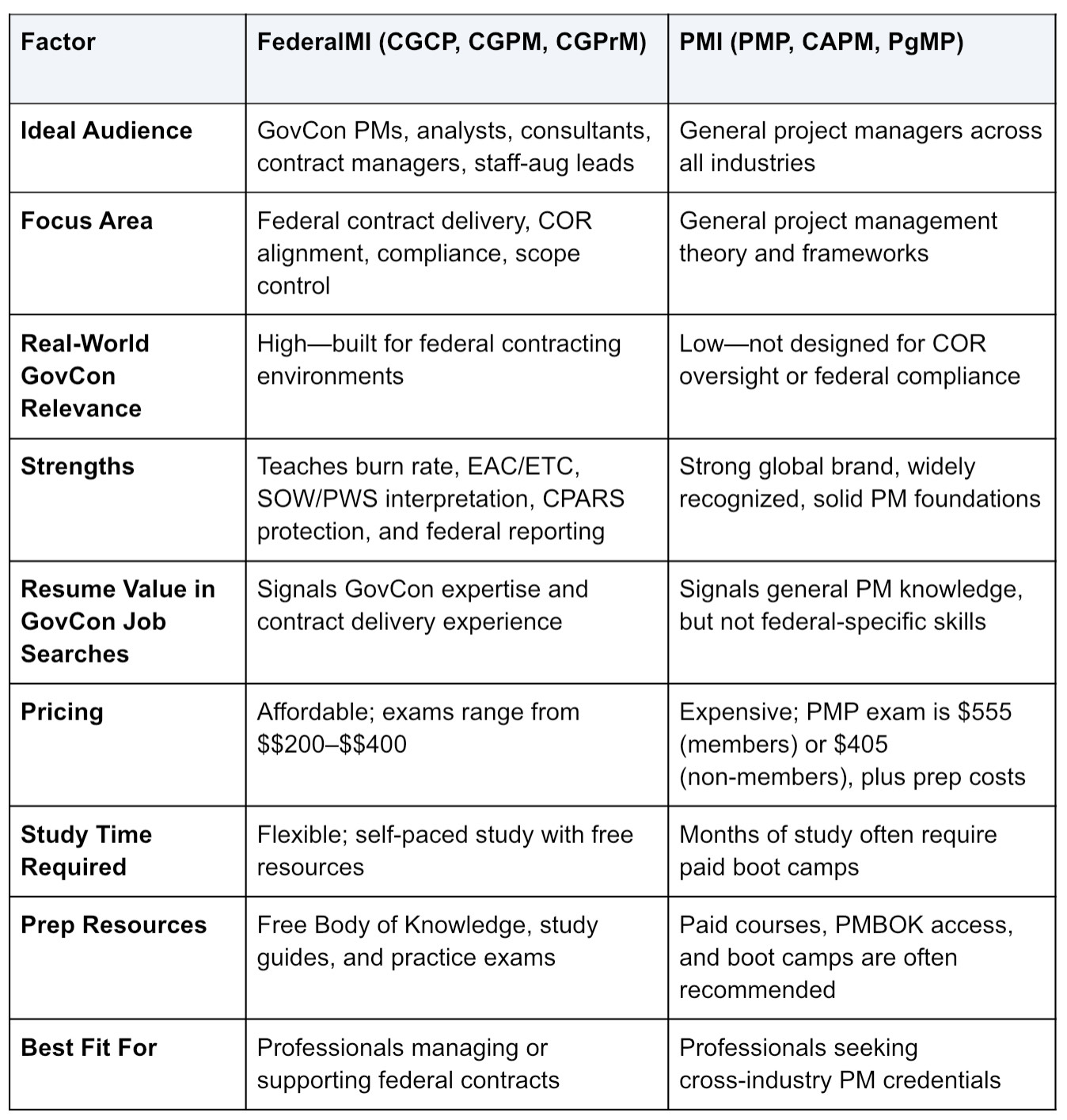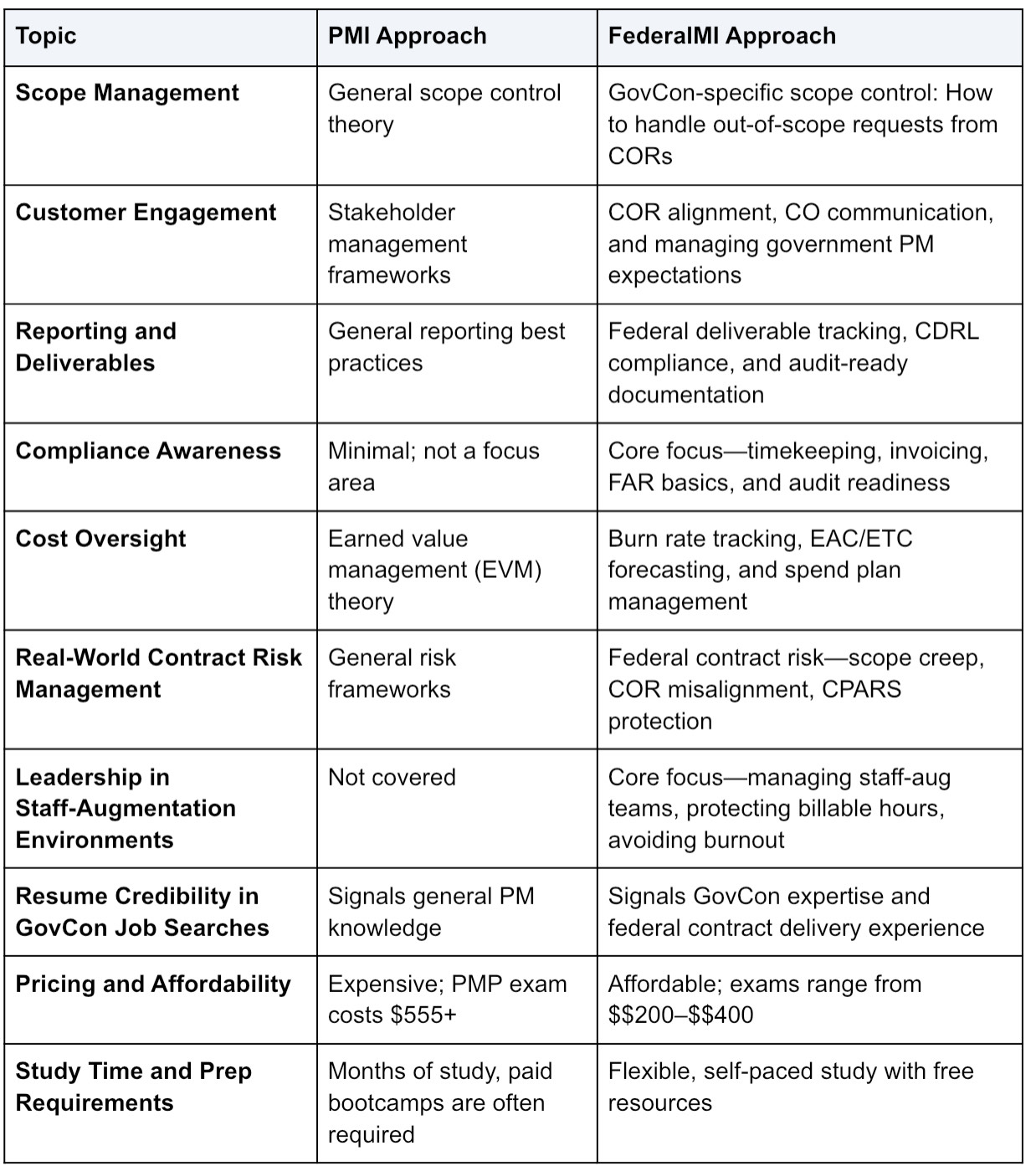 If you're choosing between the two, this article will help you understand what each offers—and why FederalMI is the better choice for anyone serious about GovCon project management certification.