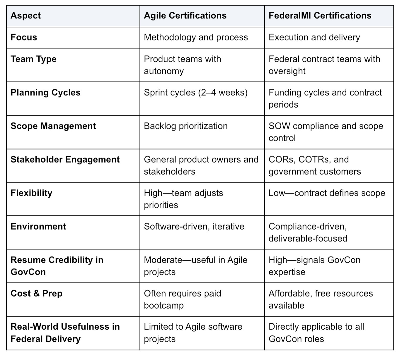 FederalMI certifications stand out because they communicate GovCon execution capability. They tell employers you know how to deliver federal contracts—not just how to run Agile ceremonies.