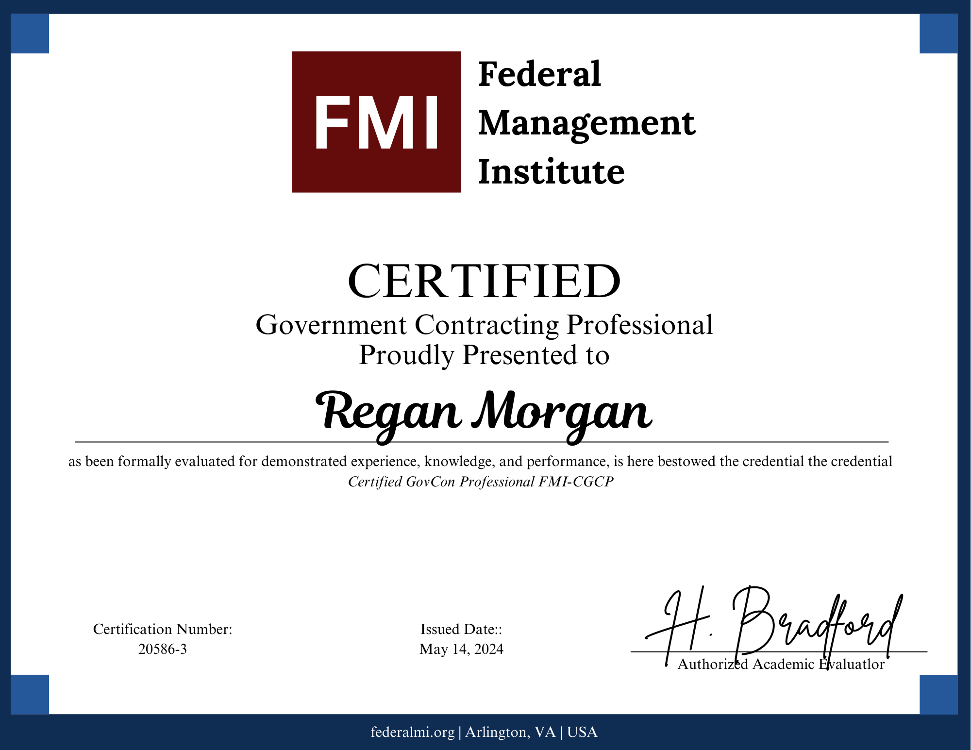 Recognition from the Federal Management Institute as a certified GovCon professional